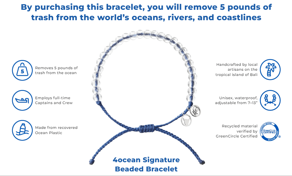 4ocean also sells products like this bracelet made from 100% recycled plastics. For each purchase, 5 pounds of trash are removed from the ocean.